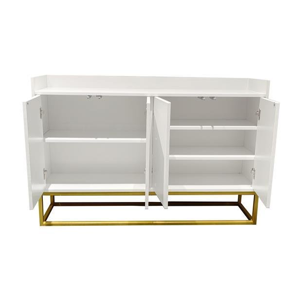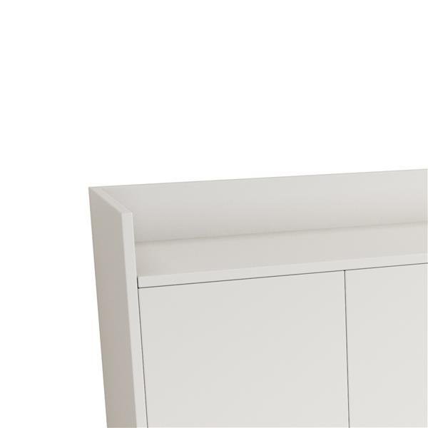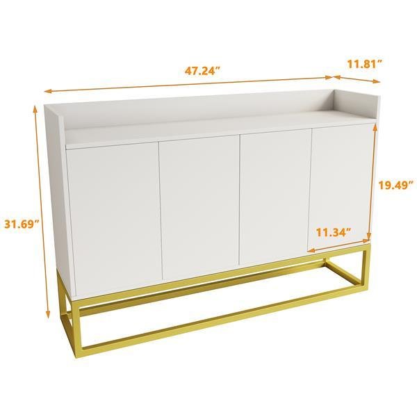 DescriptionThis stylish and functional storage cabinet is perfect for organizing your belongings while adding a touch of elegance to your home.Ideal for use in your living room or kitchen, this cabinet offers ample storage space for a wide range of items.Its sleek and modern design will complement any décor, while its compact size makes it a great space-saving solution for small apartments, condos, or homes where space is limited.Specifications:Color: WhiteMaterial: Particle board+Square Metal legsProduct Dimension: 47.24"L x 11.81"W x 31.69"HWeight Capacity:Tabletop: 80lbs Shelf: 25lbsAssembly Required: YesPackage Number: 1Notice:1. Due to lighting or display, the color of the actual product may differ slightly from the image.2. Manual measurement has been used, and there may be some reasonable errors.Sleek and Modern Design: The minimalist design of this cabinet will complement any room in your home or office, adding a touch of sophistication and elegance.Robust Construction: Made from high-quality particle board material and durable square metal legs, this cabinet is strong and long-lasting.Convenient Rebound Device: The four doors of this cabinet feature a rebound device that allows them to be easily opened and closed with a simple press in the middle, providing you with quick and convenient access to your belongings.Adjustable Shelf: The left cabinet comes with an adjustable shelf that can be set at three different heights, providing you with customizable storage solutions to accommodate various items.Sufficient storage space:This storage cabinet is functional designed to meet all kinds of storage demands. This storage cabinet is equipped with 2 enclosed cabinets, providing ample storage space for your daily use and keeping it in order. In addition, the smooth table top is an ideal place for your favorite plants, pictures and decorations.Easy Assembly: All necessary hardware and clear instructions are included, making assembly quick and stress-free.